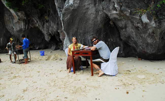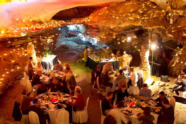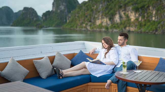 Planning a trip to Halong Bay with your partner? Want to have the romantic set up to amaze his/her? Then dining in a stunning cave is an excellent choice. Several luxury cruises with 3 days and 2 nights offer this activity, such as Dragon Pearl Junk. The extra price is costly since it usually includes set-up fee, personnel, food, and hiring the cave. After stepping inside, you and your lover will be impressed by a thousand candles and rose petals. Sweet scenery, sparkling candles, and exotic dishes will certainly create a romantic space. Plenty tourists successfully proposed to their special ones within this sweet theme.