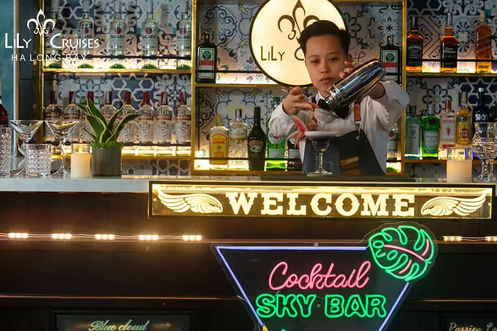 In front of the pool is a sky bar equipped with diverse types of wines and a capacity of nearly 30 people. The seating area is scattered around the deck, so you can choose any corner to admire the Halong Bay view.
